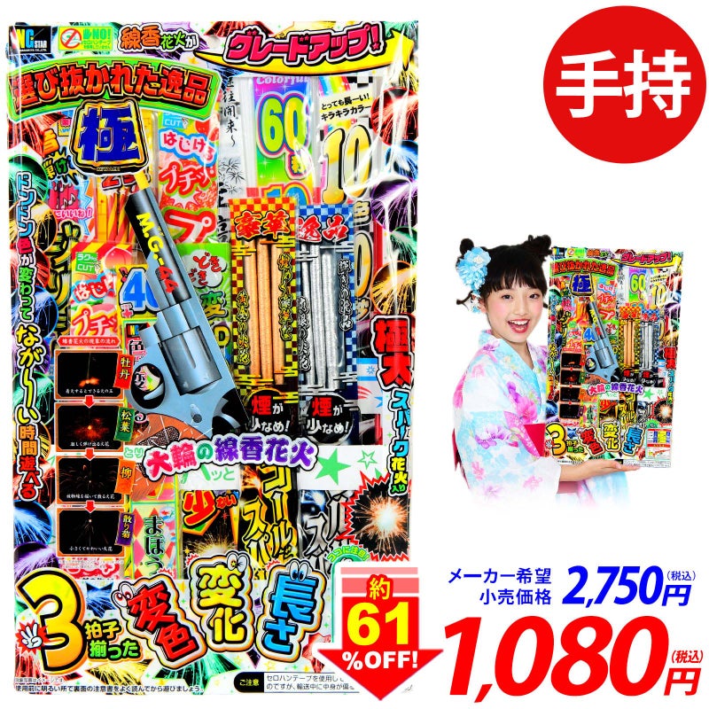 選び抜かれた【極】の花火セット「長時間燃焼」「+「変色」+「変化」を取り入れ、さらにピストル型花火、一味違う線香花火などが入ったセットです。