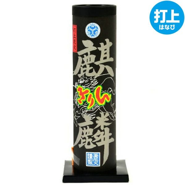 夜空に輝く鮮やかな麒麟の十文字星上空で大きく炸裂し、白色の点滅星を芯にして鮮やかなレモン色の星が尾を引きながら十文字に広がります。