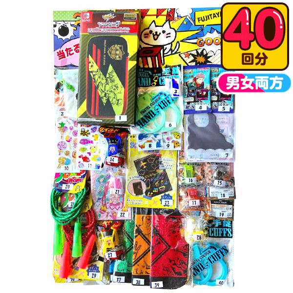 大当たり景品と小当たり景品が合計40個付いています。 楽しく遊べるグッズがいろいろミックス!!いろんな種類のグッズが取り揃った楽しい当てくじです。