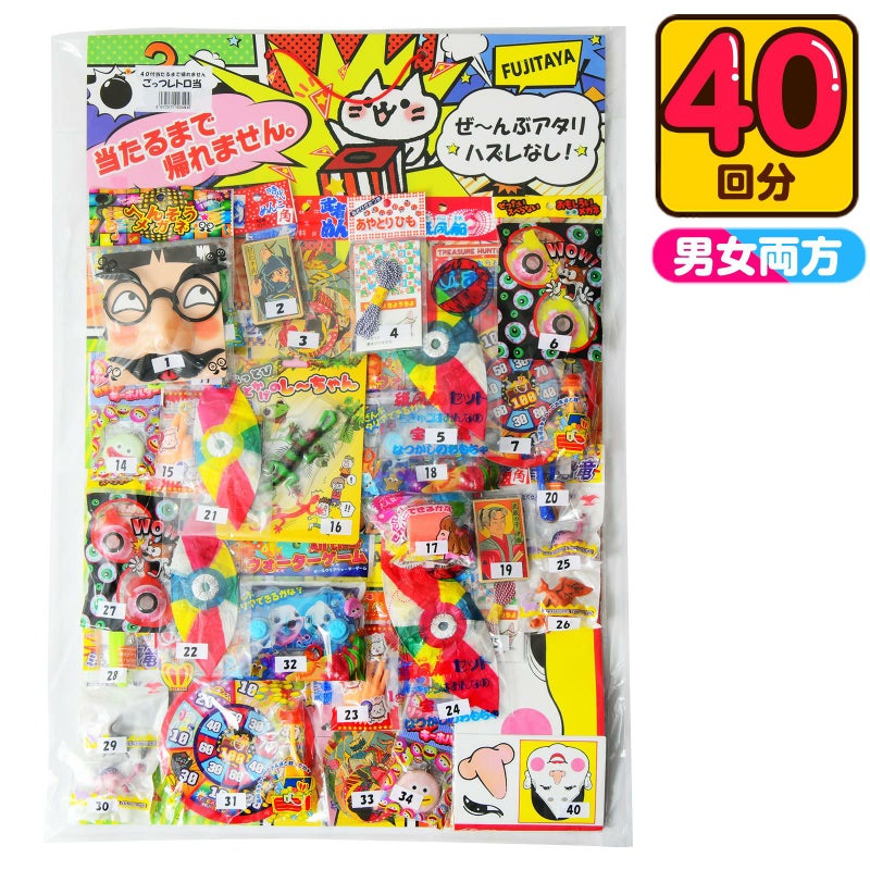 大当たり景品と小当たり景品が合計40個付いています。番号くじを引いておもちゃが当たる当て物です。
