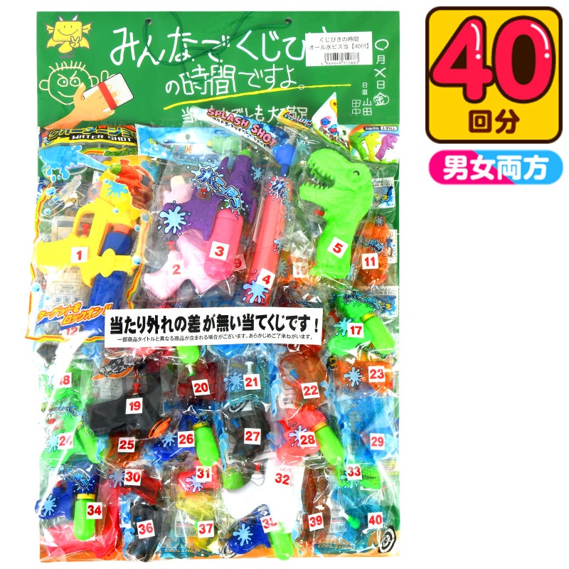 | 商品説明 | この商品は、子供たちが大好きな水鉄砲を景品に使用した当てくじで、誰でも楽しめる盛り上がり必至のアイテムです。 パーティーやお誕生日会、自治会、町内会、子供会、小学校の夏休みイベントなどにピッタリ! 当たり・ハズレの差が少なく、子どもたち全員が笑顔になれるくじびきです。 「またやりたい!」とリピート間違いなしの人気シリーズです。 |