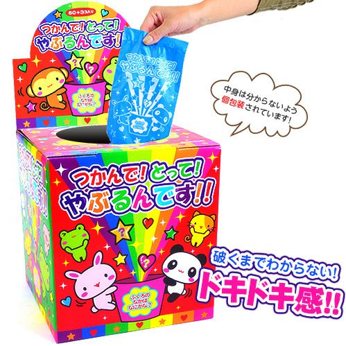 大当たり景品と小当たり景品が合計60個付いています。なにがでるかな?つかんでもまだ袋を破くまで中身が分からない!それがつかんで!とって!やぶるんです!