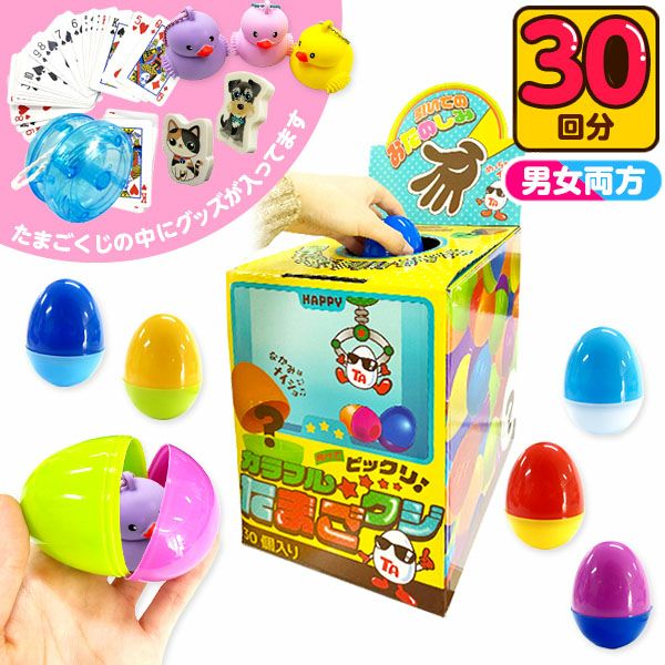 大当たり景品と小当たり景品が合計30個付いています。 何が当たるかドキドキワクワク・・・!!カラフルでかわいいたまごくじの中身には、遊び心のあるグッズがいろいろ揃った楽しいくじです。