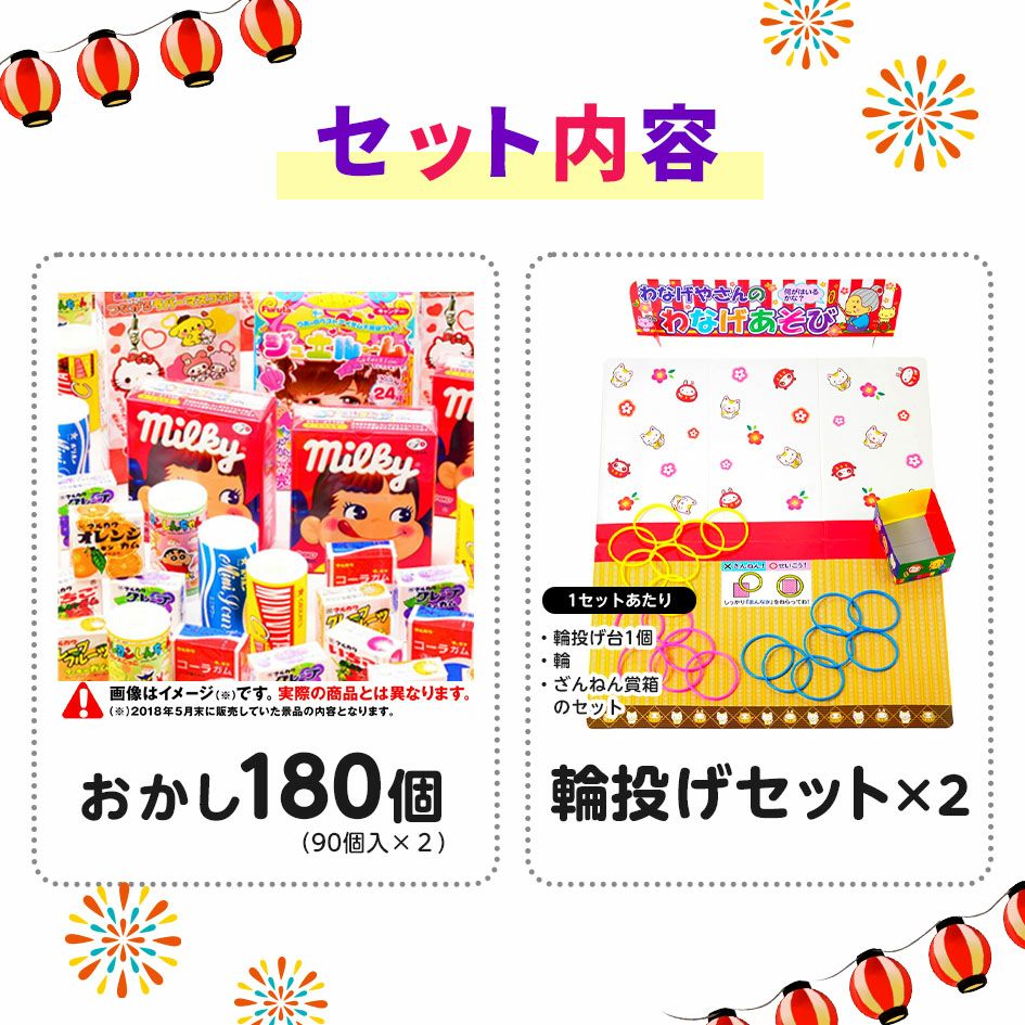 他の画像を見る 当てくじこれ1つで輪投げやさんになれる! おかし180個・輪投げセット×2 セット 輪投げやさんのわなげあそび { 当てくじ 幼稚園 夏祭り 景品 輪投げ わなげ 人気 男の子 女の子 子供 問屋 駄菓子 }{ 子供会 お祭り くじ引き 縁日 あてくじ 当て アテクジ クジ くじ くじびき お菓子 おかし }[24E08] メーカー希望小売価格 オープン価格 のところ 当店特別価格 ¥ 8,470 税込 在庫切れ 再入荷お知らせ お気に入りに登録する