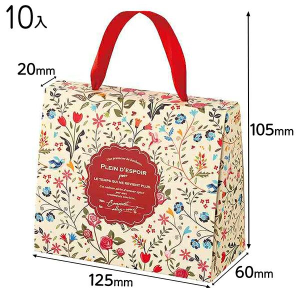 色とりどりの可愛い花柄と赤いリボンの持ち手が可愛いバッグ型のギフトボックスです。