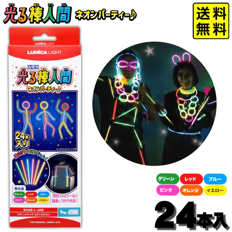 光る棒人間がすぐ作れる!24本セット光る棒と取り付けテープ付きで、衣服に貼るだけ!