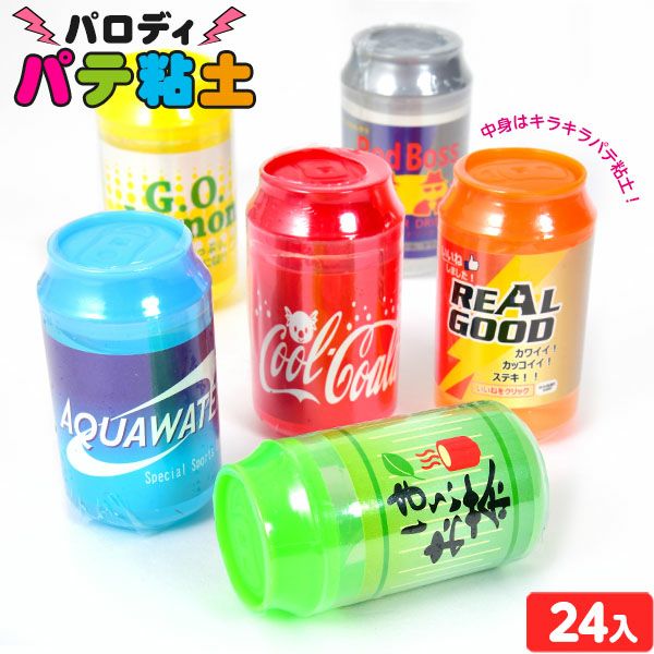 たっぷり遊べる大容量の50g!!パロディデザインのジュース缶には形を作りやすく、ひんやりとした感触で硬めのパテ粘土が入っています。