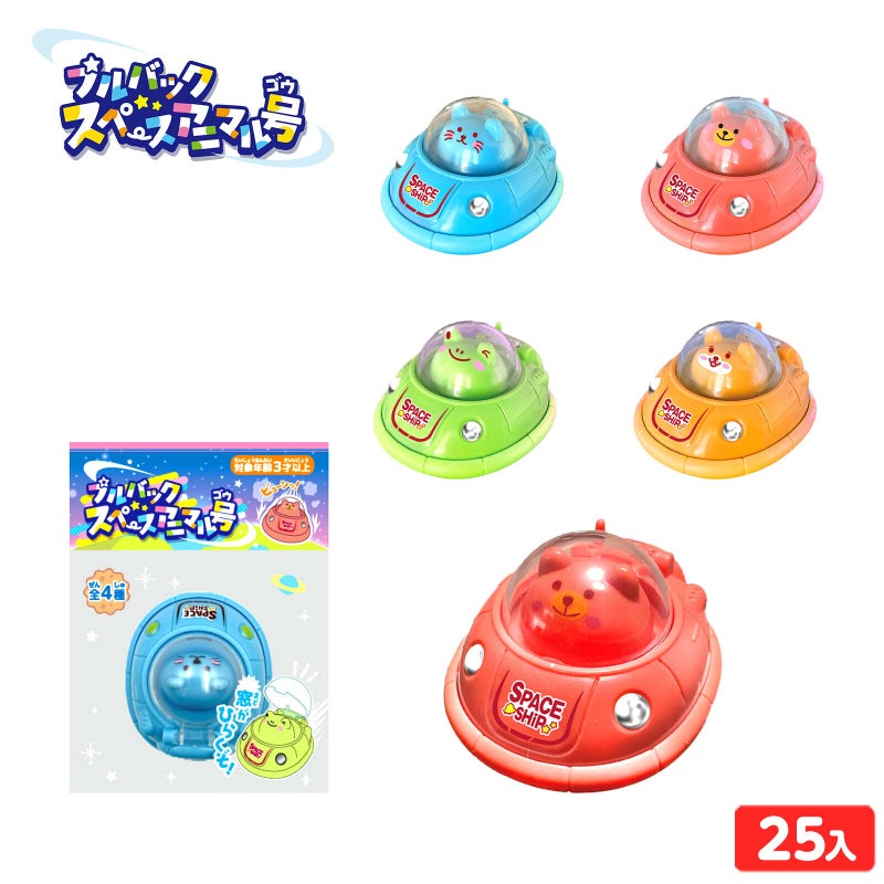 プルバックで走る!かわいいスペースアニマル号かえるやくまさんが乗った宇宙船をうしろに引っぱって手を離すと、ビューンと走り出すよ。