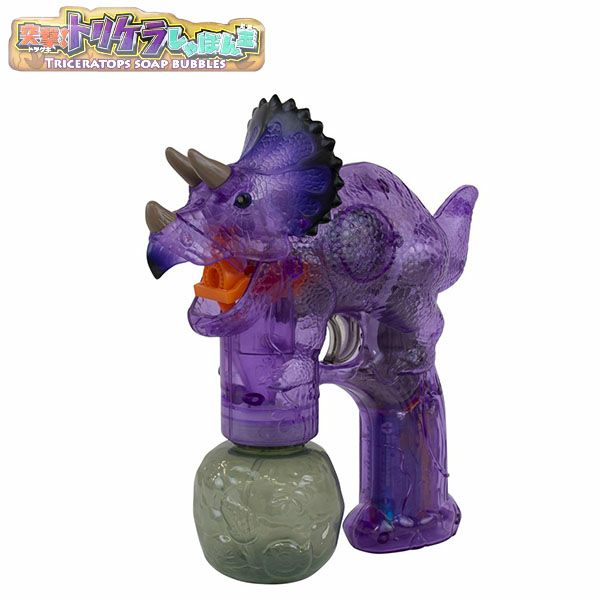 【光る恐竜が大量のシャボン玉を連射!】トリガーを引くと、トリケラトプスが光る!音楽が流れる!口からシャボン玉が飛び出す、電動シャボン玉バブルガンです。