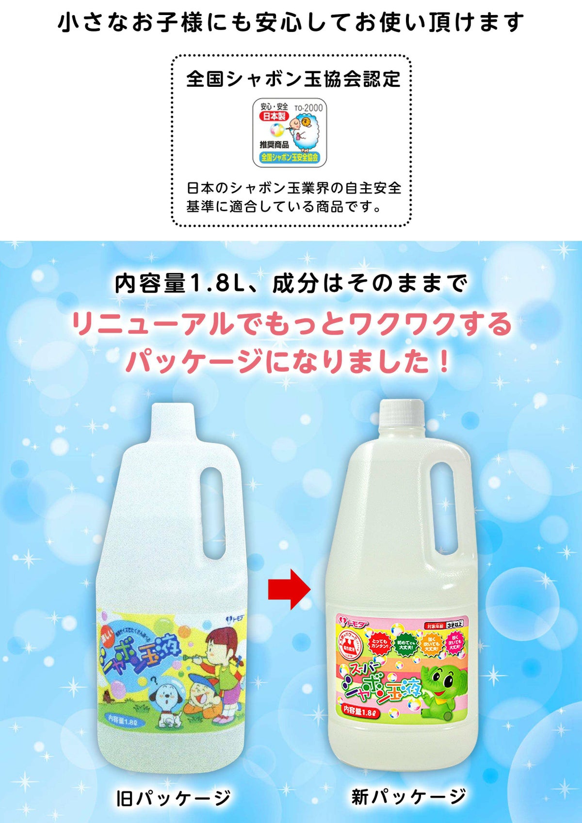 他の画像を見る おもちゃ しゃぼん玉 しゃぼんだま イベント 結婚式 ウエディング 業務用 問屋 卸売り トモダ スーパーシャボン玉液 1800ml 2本セット { 景品玩具 }{ 補充液 補充 日本製 シャボン液 しゃぼん玉液 しゃぼん液 バブルアート 1.8リットル 大量 大容量 人気 }275[23H10] 送料無料(※沖縄・離島発送不可){即日出荷 配送区分D} メーカー希望小売価格 オープン価格 のところ 当店特別価格 ¥ 2,200 税込 カートに入れる お気に入りに登録する