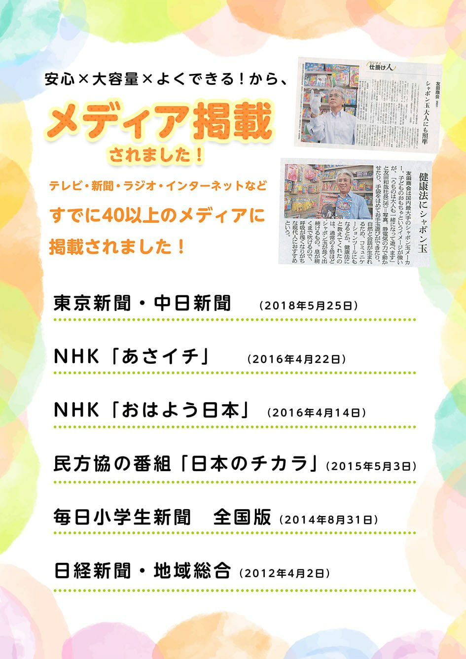 他の画像を見る 1個あたり約43.8円(約48.2円税込)x25個入=1096円(1206円税込)安心・安全の日本製しゃぼん玉 トモダ 袋入り シャボン玉 25個入 { 景品玩具 しゃぼんだま しゃぼん玉 シャボン 外遊び 公園 }{ 景品 玩具 おもちゃ オモチャ 人気 子供 お祭り 子供会 イベント パーティー くじ引き 福引き 輪投げ 射的 お子様ランチ 販促 配布 }275[24A25] メーカー希望小売価格 オープン価格 のところ 当店特別価格 ¥ 1,206 税込 カートに入れる お気に入りに登録する