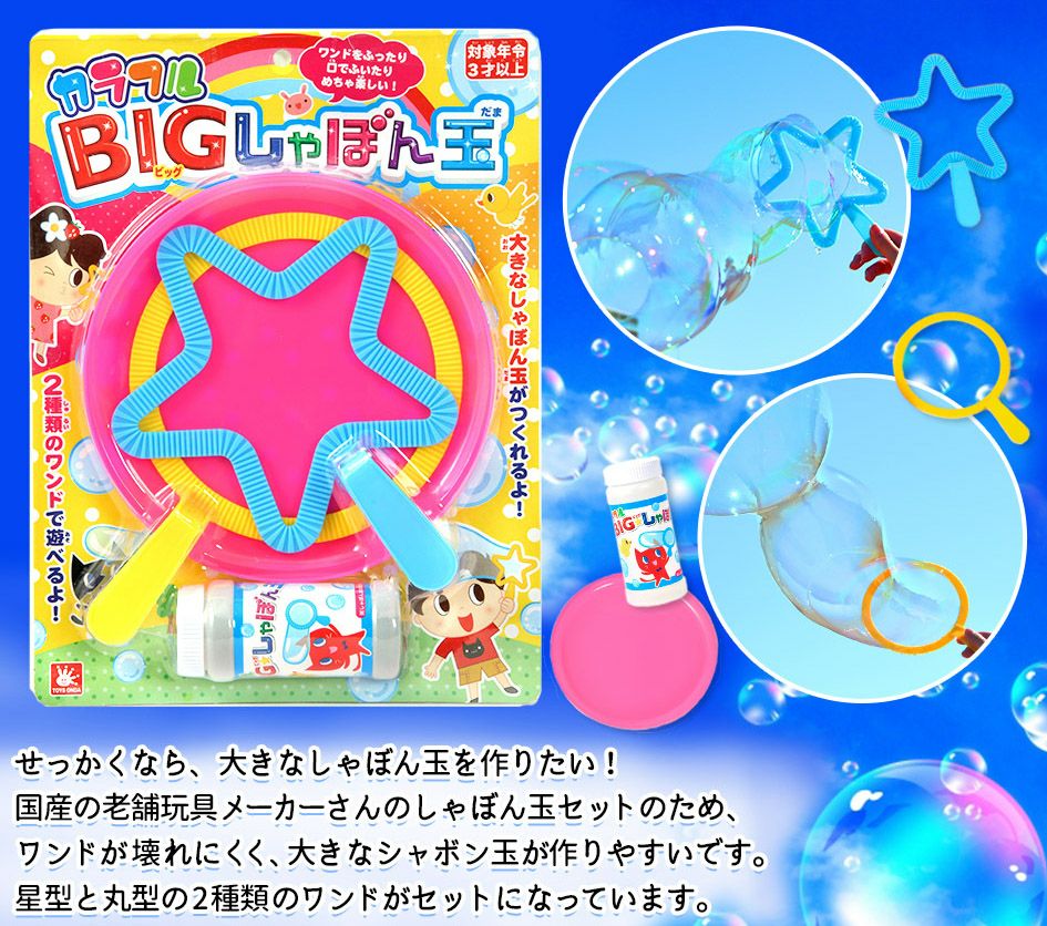 他の画像を見る カラフルBIGしゃぼん玉 { 景品玩具 しゃぼん玉 シャボン玉 外遊び おうち遊び }[25B01][dmo] メーカー希望小売価格 ¥ 638 のところ 当店特別価格 ¥ 447 税込 カートに入れる お気に入りに登録する