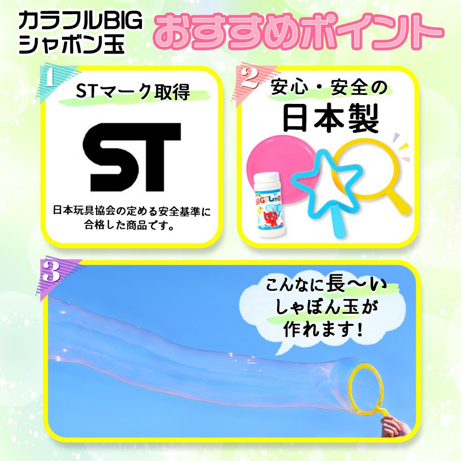 他の画像を見る 単価75円(82.5円税込)x12入=900円(990円税込) トモダ はじめてのシャボン玉(3本袋) 12入 { 景品玩具 しゃぼん玉 しゃぼん シャボン 日本製 国産 }{ 子供会 景品 お祭り くじ引き 縁日 お子様ランチ おもちゃ }275[24E21] メーカー希望小売価格 オープン価格 のところ 当店特別価格 ¥ 990 税込 カートに入れる お気に入りに登録する