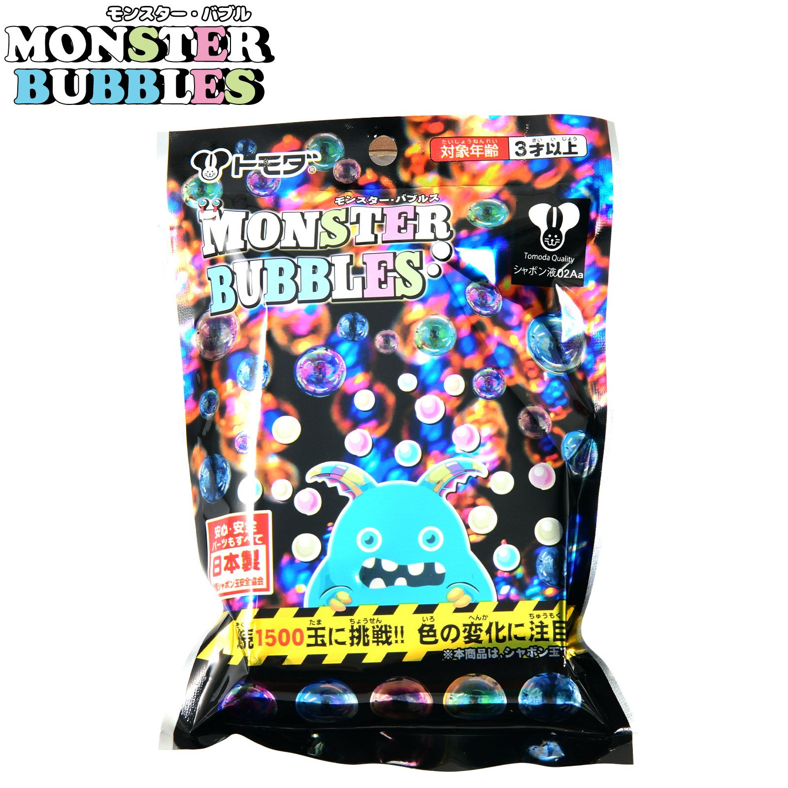 色が変わる魔法のしゃぼん玉!モンスター・バブルスは、吹き続けるうちに玉の色が変化する不思議なシャボン玉!縁日やお祭り、夏祭りのイベントで大人気の超連続しゃぼん玉です。