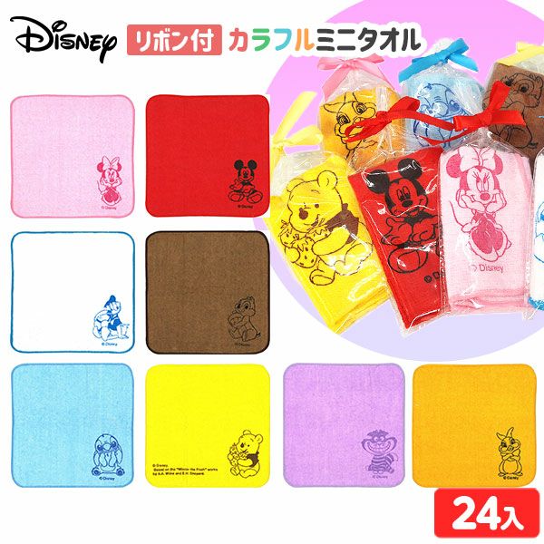 リボン付でそのまま渡せるギフトとして超人気♪♪カラバリたくさん!シンプルでかわいいディズニーキャラクターたちのワンポイントデザインのミニタオルです。