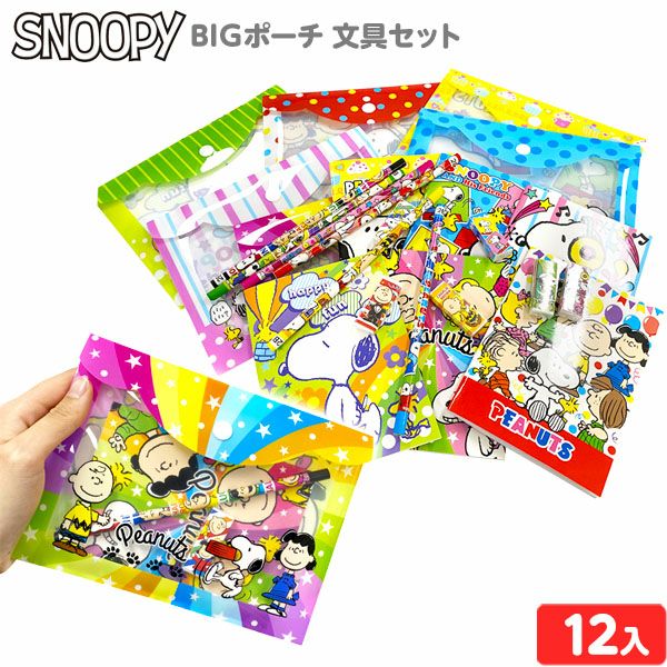パーティー・イベントなどの配布用に人気の文具セット!かわいいスヌーピーデザインのポーチとミニノート、鉛筆、消しゴムのセットです。