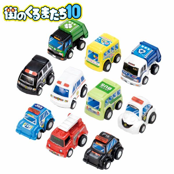 みんなの街で大活躍! はたらくくるまが大集合!!プルバックで走る、こどもの手の平サイズの可愛いミニカー10台セットです。