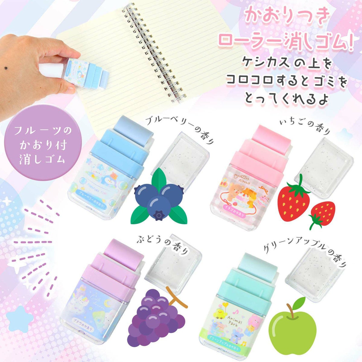 他の画像を見る 1個装あたり85円(93.5円税込)x12個装入=1020円(1122円税込)消しカスもスッキリ☆ フルーツのかおり付きローラー消しゴム ゆるふわ ローラー消しゴム 12個装入 { 景品玩具 消しゴム ケシゴム かわいい 消しカス かわいい 女の子 }{ 景品 おもちゃ 詰め合わせ 夏祭り 縁日 問屋 子供 子供会 自治会 祭 お子様ランチ 大量 保育園 幼稚園 イベント 配布 }283[25I03] メーカー希望小売価格 オープン価格 のところ 当店特別価格 ¥ 1,122 税込 カートに入れる お気に入りに登録する