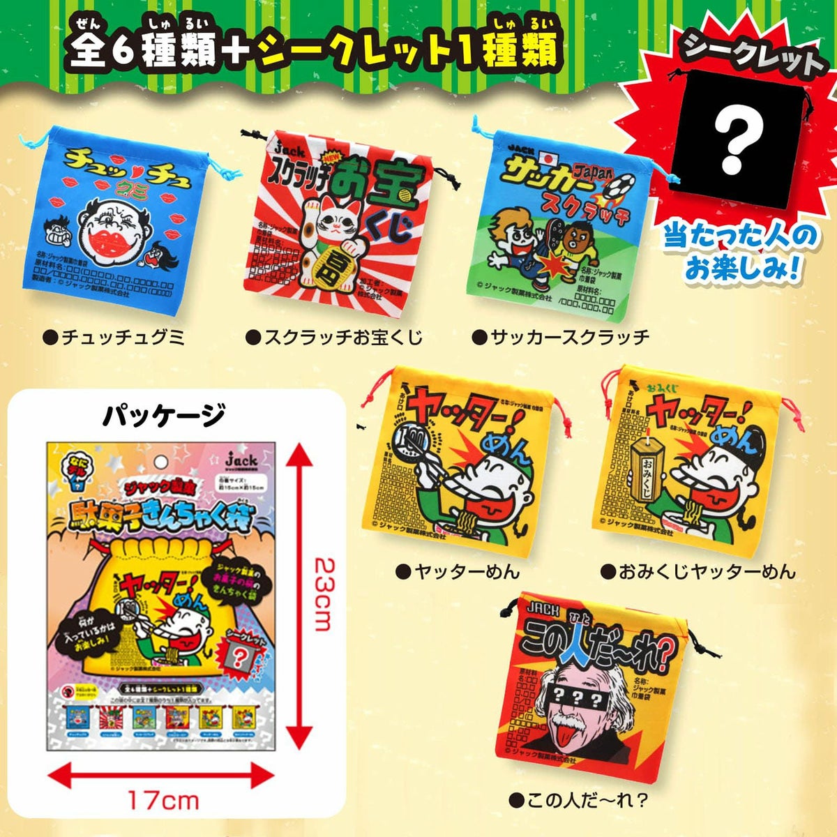 他の画像を見る 1個装あたり82円(90.2円税込)x20個装入=1640円(1804円税込)駄菓子で見たことある!なデザイン巾着袋 ジャック製菓 駄菓子 きんちゃく袋 20個装入 { 景品玩具 巾着袋 小物袋 詰め合わせ 小物入れ }{ 景品 おもちゃ お祭り 夏祭り 縁日 問屋 子供 子供会 お子様ランチ 保育園 幼稚園 イベント 配布 }246[25F12] メーカー希望小売価格 オープン価格 のところ 当店特別価格 ¥ 1,804 税込 カートに入れる お気に入りに登録する