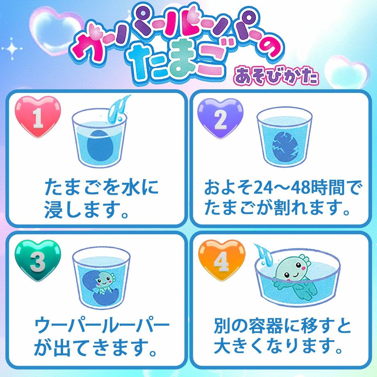 他の画像を見る 1個装あたり105円(115.5円税込)x12個装入=1260円(1386円税込)水につけておくだけで誕生する不思議なたまご ウーパールーパーのたまご 12個装入 { 景品玩具 卵 たまご 実験 観察 知育 育てる }{ 景品 おもちゃ 詰め合わせ お祭り 夏祭り 縁日 問屋 子供 子供会 自治会 祭 大量 保育園 幼稚園 イベント 配布 }227[25D10] メーカー希望小売価格 オープン価格 のところ 当店特別価格 ¥ 1,386 税込 カートに入れる お気に入りに登録する