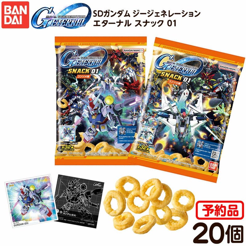 さらに、期間中「SDガンダム ジージェネレーション エターナル スナック 01(10個入)」をプレミアムバンダイでご予約いただいた方全員に『SDガンダム ジージェネレーション エターナル』のアプリ内で利用可能な「プレミアムガシャチケット×1」「称号:コンソメマスター」が入手できるプロモーションコードをプレゼント!