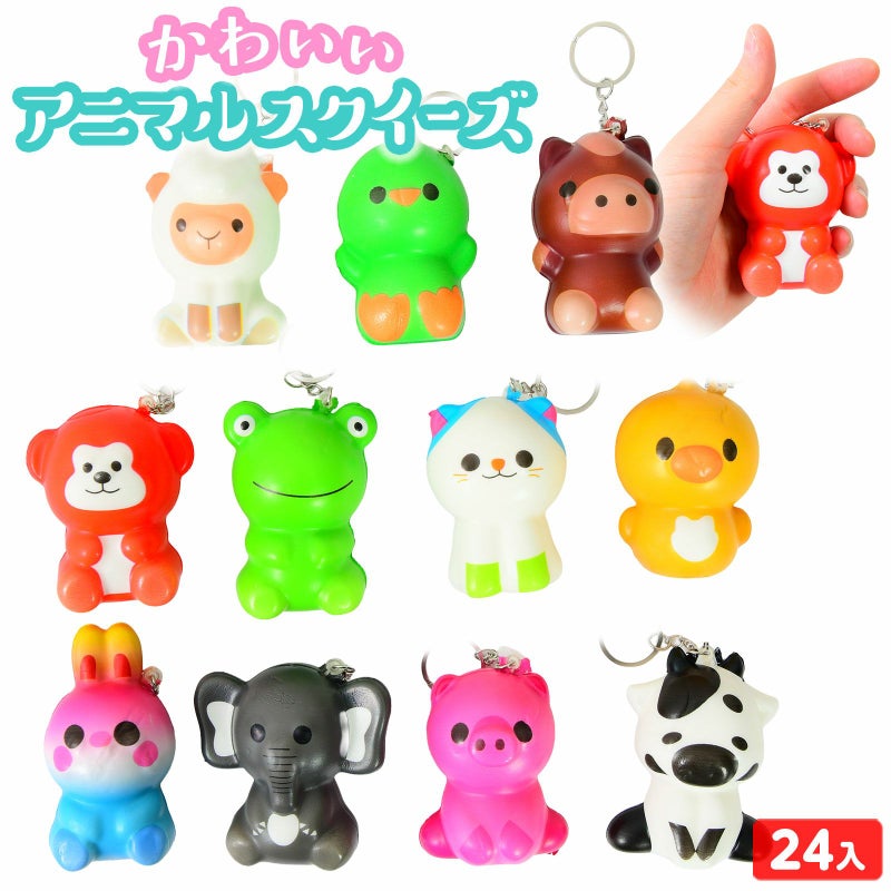 むぎゅぅーっとしたくなるかわいさ♪ゾウやアヒル、ネコやおさるなどかわいいどうぶつの形をしたかわいいスクイーズです。