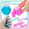 全長5cm。クリアでカラフルなハートボトルデザインの容器入りのスライム粘土です。
