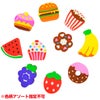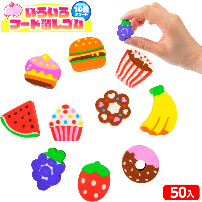 消しゴムすくいや、大量配布の景品に!全長約2cm。バナナ、いちごなどのフルーツや、ハンバーガー、ケーキ、ドーナツなどのたべものを10種集めた小さくてかわいい消しゴムがたくさん入ったアソートパックです。