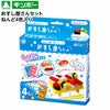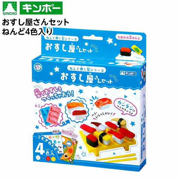 【セット内容】小麦ねんど4色 (白青赤黄/各30g)・保存袋・紙製ねんど板(両面)・押し型4 個・ねんどローラー・すしげた・しょうゆ皿・おはし