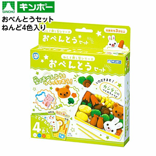 【セット内容】こむぎねんど4色(白・青・赤・黄)各30g、保存袋、紙製ねんど板(両面)、おべんとう 箱、おはし、ごはんローラー、ぬき型2個、押し型4個