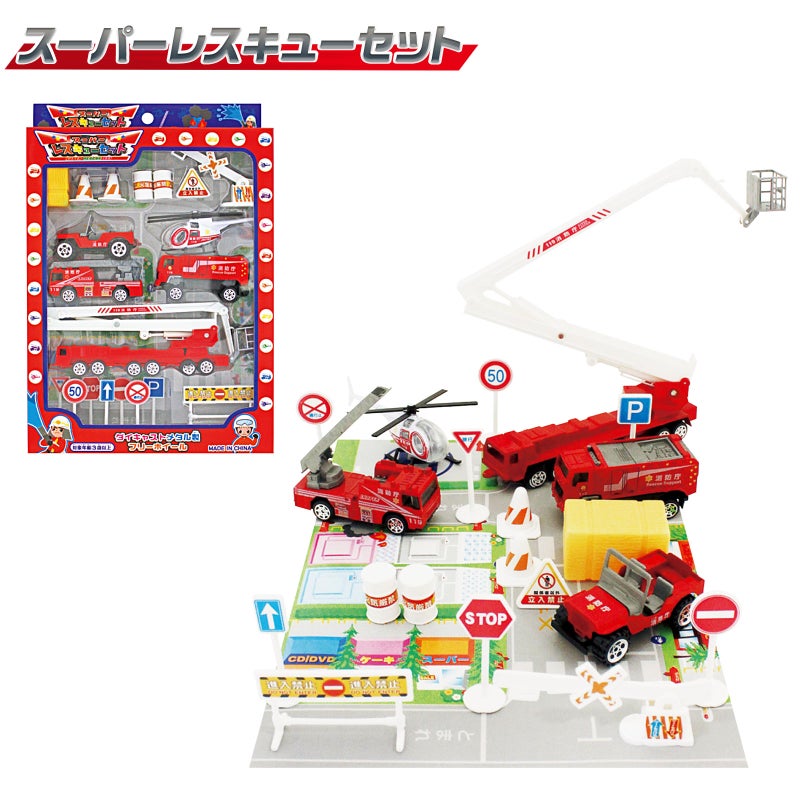 ヘリコプターやはしご車、消防車などの車両やバリケード、標識などのアイテムで自分の好きなレイアウトを考えて楽しめる人気玩具です。夏祭りや縁日の景品、くじ引き、イベント、誕生日プレゼントやお祝いなど、幅広いシーンで喜ばれるアイテムです。