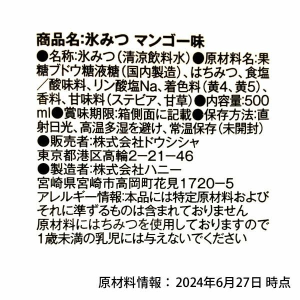 他の画像を見る 全7種類天然甘味料使用 保存料ゼロ かき氷 シロップ甘味料・保存料は、無添加 となっております。完全 無添加 ではございません。 【マンゴー:賞味期限2026年4月16日】 ご家庭用お手頃サイズ 氷みつ各種 500ミリリットル 7種類 { 子供会 景品 お祭り くじ引き 縁日 }{ 縁日 お祭 イベント 500ml かき氷シロップ カキ氷シロップ 氷みつ }[26B02][dmo] メーカー希望小売価格 オープン価格 のところ 当店特別価格 ¥ 99 税込 〜 当店特別価格 ¥ 税込 販売期間 2026/02/02 0:00 〜 2026/04/02 7:30 詳細を見る お気に入りに登録する