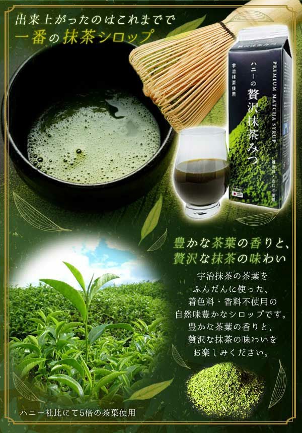 他の画像を見る 宇治抹茶の茶葉をふんだんに使用した、こだわりの抹茶みつ! ハニーの 贅沢抹茶みつ 900ml { ハニー 抹茶 抹茶みつ かき氷シロップ 抹茶シロップ }{ かき氷 カキ氷 業務用 シロップ アイス 縁日 イベント パーティー かきごおり 氷みつ }[25F14][dmo]{即日出荷 配送区分D} メーカー希望小売価格 オープン価格 のところ 当店特別価格 ¥ 1,325 税込 カートに入れる お気に入りに登録する