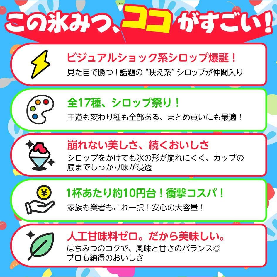 他の画像を見る 送料無料!!全31種類からお好きな組み合わせで選べる! 【選べる】【24本セット / 8本単位 3種選択】 かき氷 シロップ 高級氷みつ Aタイプ 1.8リットル { ハニー 氷みつ 縁日 お祭り イベント 業務用 まとめ買い 1800ml }{ 子供会 景品 夏祭り 幼稚園 保育園 }[25G24][dmo] 送料無料(※沖縄・離島発送不可) メーカー希望小売価格 オープン価格 のところ 当店特別価格 ¥ 16,500 税込 詳細を見る お気に入りに登録する