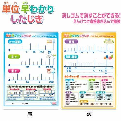 表面は【かさ(液量)・長さ・重さ】、裏面は、【面積/体積と容積】の単位が分かる早わかり下敷きです。