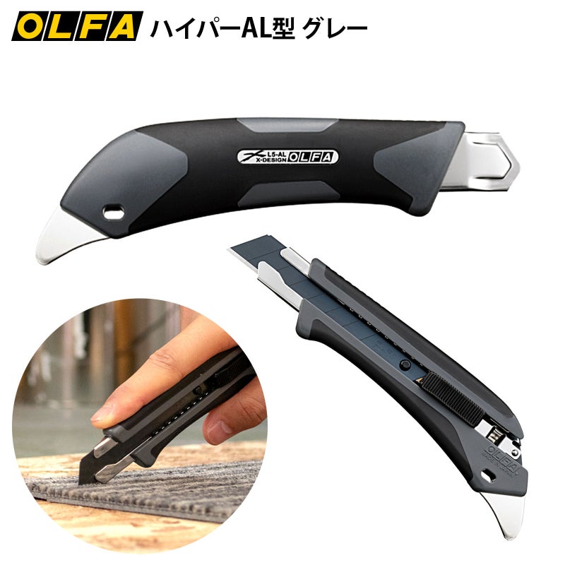 オートロック式の特専黒刃カッター握ったときに滑らず、力のかけやすい形状を追求したX(エックス)デザイン・ハイパーAL型のカッターです。