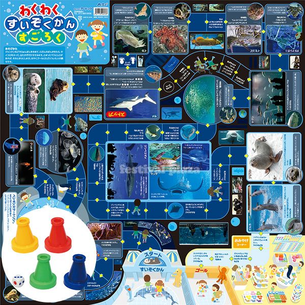 イラストと写真つきで水中の生き物の豆知識が覚えられる!すごろくゲームで水族館の雰囲気を楽しんで遊べるよ。