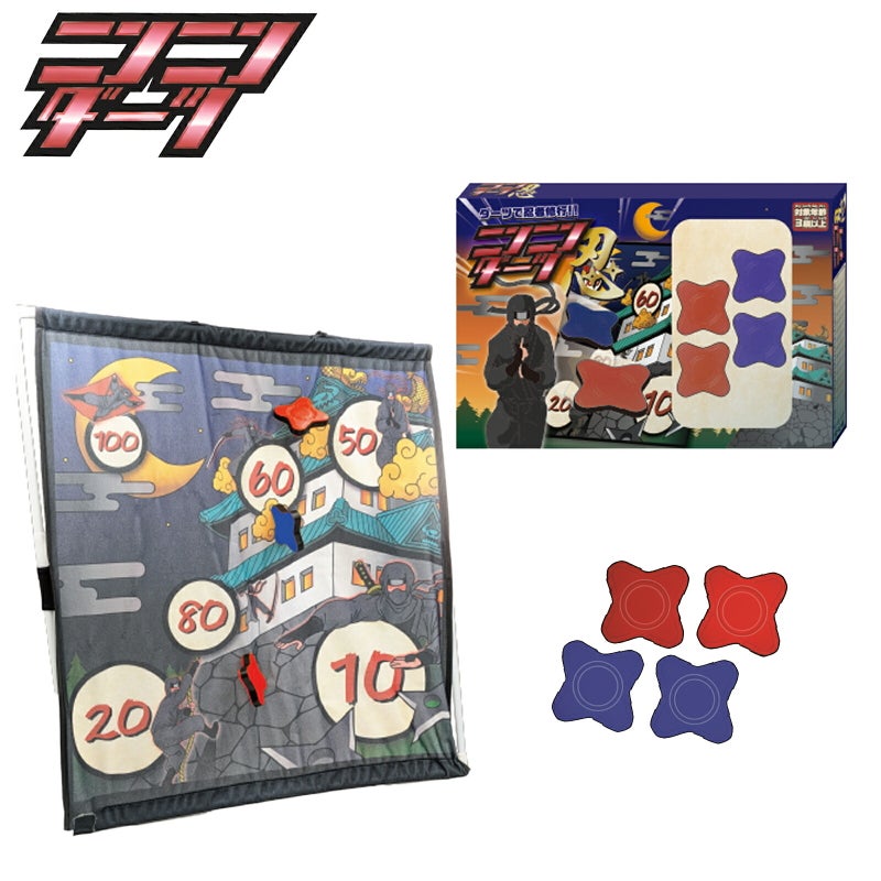 掛け軸型のダーツボードに高得点の的を狙って手裏剣を投げる人気玩具。ダーツで忍者修行ができるおもちゃです。夏祭りや縁日の景品、くじ引き、イベント、誕生日プレゼントやお祝いなど、幅広いシーンで喜ばれるアイテムです。