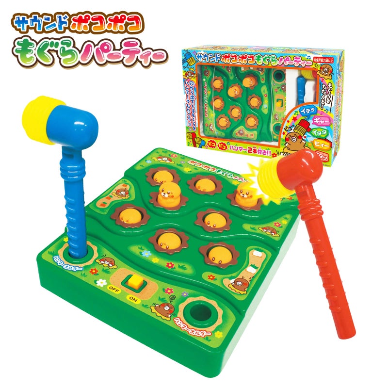 穴から出てくるもぐらをハンマーでたたくと『イタッ』・『ギャー』などと叫ぶ人気玩具。楽しい音が鳴るおもちゃです。夏祭りや縁日の景品、くじ引き、イベント、誕生日プレゼントやお祝いなど、幅広いシーンで喜ばれるアイテムです。