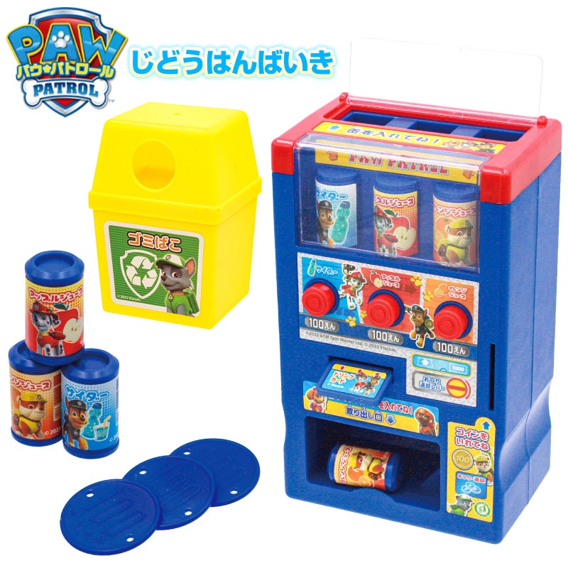 コインを入れてドリンクを買う本格的な自動販売機おもちゃ。パウパトロールのゴミ箱付きで遊びながらお片付けも覚えられる人気キャラクター。誕生日プレゼントやお祝いのギフトに最適な知育おもちゃです。