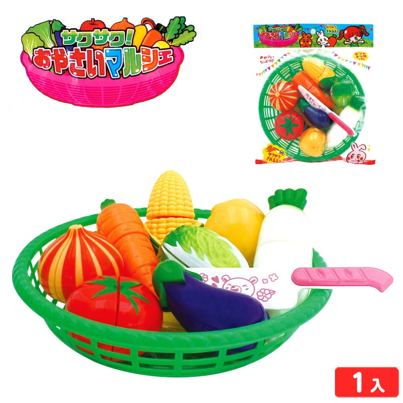 トマト・玉ねぎ・人参など、ざるに入った色々な野菜をまな板と包丁でサクサク切れる人気玩具。野菜マルシェごっこが楽しめるおもちゃです。夏祭りや縁日の景品、くじ引き、イベント、誕生日プレゼントやお祝いなど、幅広いシーンで喜ばれるアイテムです。