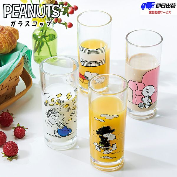 スヌーピーデザインがキュート☆どんな飲みものも絵になるかわいさの、細長シェイプガラスコップです。