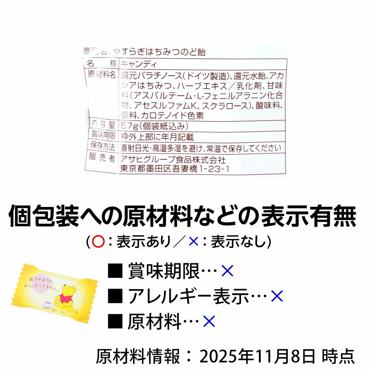 他の画像を見る 乾燥する季節に!まずはのどケアからはじめてみませんか? アサヒグループ食品 やすらぎはちみつのど飴 57g { 駄菓子 お菓子 はちみつ 蜂蜜 のど飴 喉あめ のどアメ のどあめ 風邪予防 乾燥予防 ノンシュガー }{ お菓子 おかし おやつ 問屋 飴 あめ アメ キャンディー }[25K03][dmo] メーカー希望小売価格 オープン価格 のところ 当店特別価格 ¥ 228 税込 在庫切れ 再入荷お知らせ お気に入りに登録する