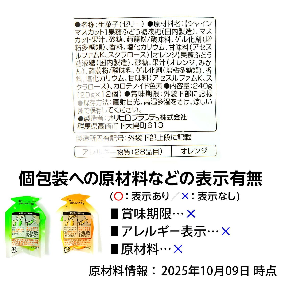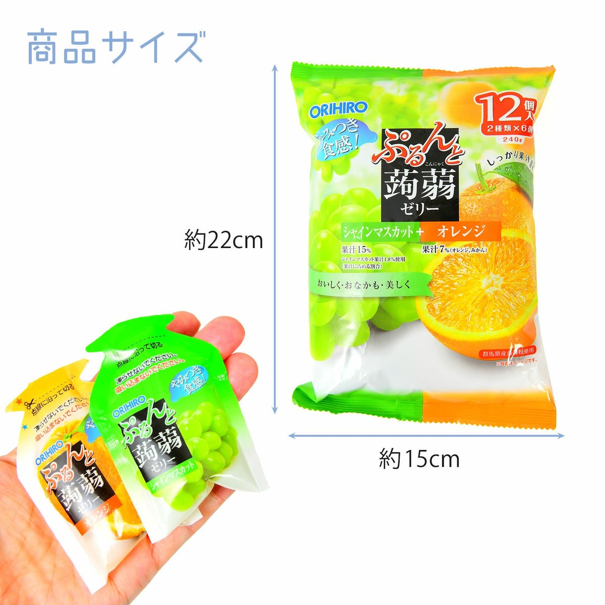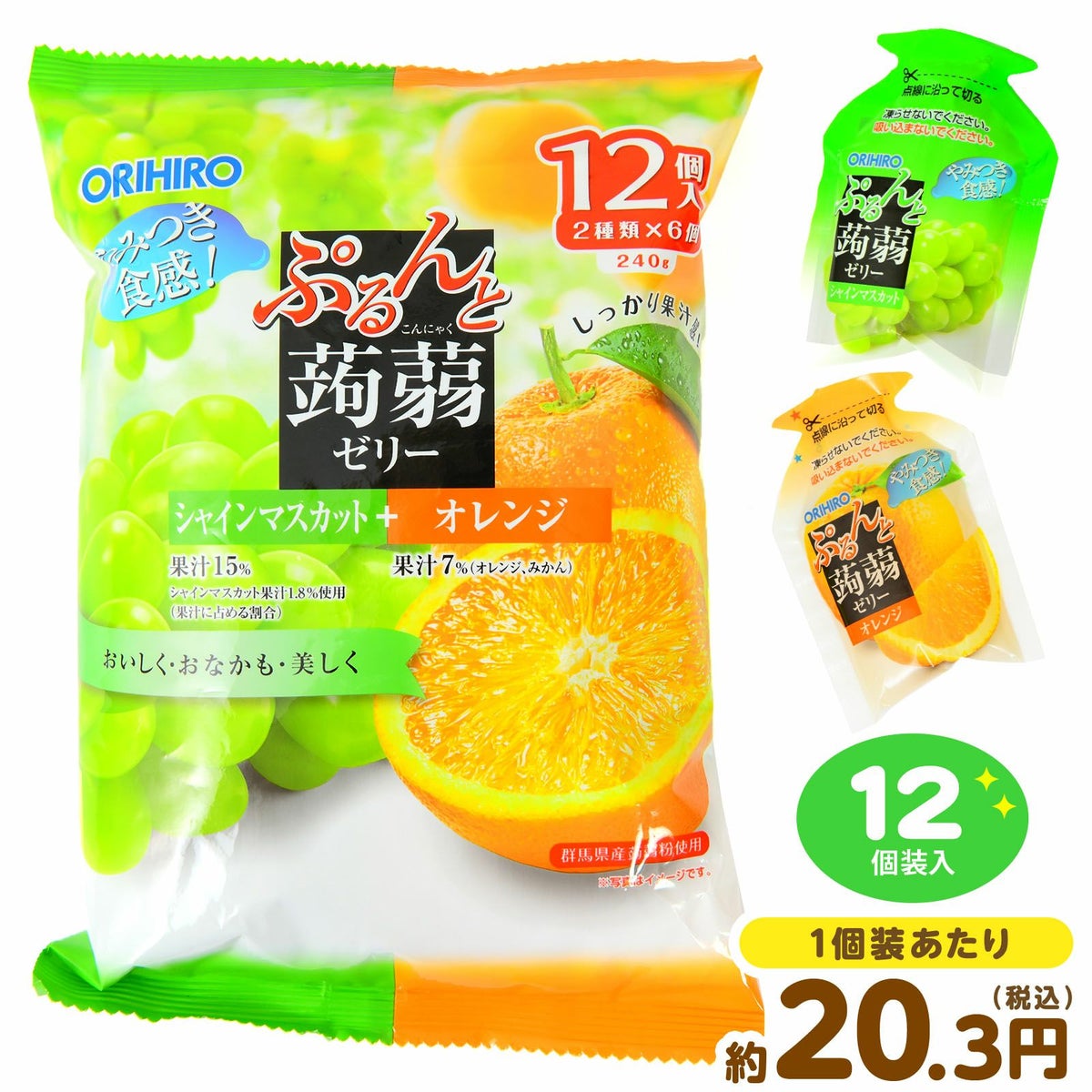 他の画像を見る 1個装あたり約18.8円(約20.3円税込)x12個装入=225円(243円税込)しっかり果汁感☆やみつき食感! オリヒロ ぷるんと蒟蒻ゼリー シャインマスカット+オレンジ 12個装入 { 駄菓子 お菓子 蒟蒻 ゼリー 蒟蒻ゼリー お弁当 遠足 スポーツ }{ おかし おやつ 景品 お祭り 夏祭り 縁日 問屋 子供 子供会 自治会 詰め合わせ 大量 イベント 配布 個装 }[25I24][dmo] メーカー希望小売価格 オープン価格 のところ 当店特別価格 ¥ 243 税込 カートに入れる お気に入りに登録する