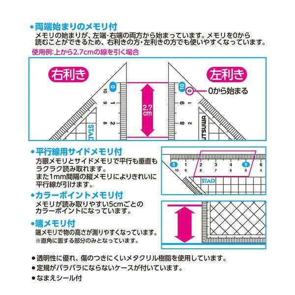 他の画像を見る NEW!!2024年度新作!読み取りやすいポイントメモリ付で便利 クツワ メタクリル 三角定規 10cm HAA120 { 新入学文具 定規 物差し ものさし 小学生 中学生 高校生 小学校 中学校 高校 事務用品 }{ 文具 文房具 学用品 筆記用具 新入学 入学準備 新学期 ギフト プレゼント お祝い }400[25J04] メーカー希望小売価格 ¥ 352 のところ 当店特別価格 ¥ 264 税込 カートに入れる お気に入りに登録する