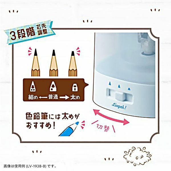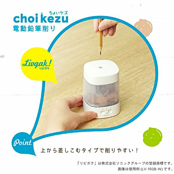 他の画像を見る 機能性・安全性も兼ね備えた、電動鉛筆削り器 ソニック SONIC ちょいケズ 電動 鉛筆削り 芯先調整付 乾電池・USB両対応 リビガク LV-1924-W LV-1924-B { 新入学文具 鉛筆削り器 小学生 小学校 }{ 文具 文房具 新入学 新学期 子供 プレゼント お祝い }423[25B03][dmo] メーカー希望小売価格 ¥ 1,980 のところ 当店特別価格 ¥ 1,485 税込 カートに入れる お気に入りに登録する