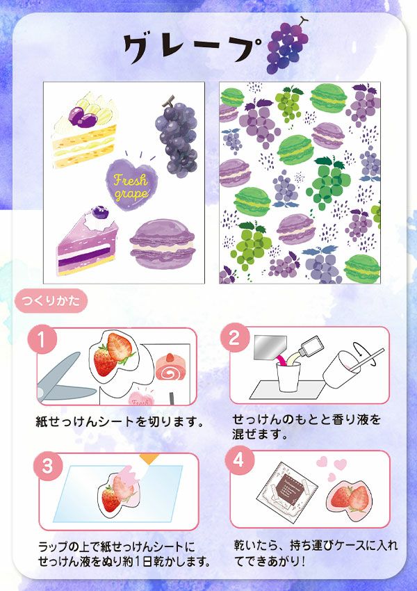他の画像を見る ぶどうの香りの手作り紙せっけんが作れるキット クツワ フルーツかみせっけん グレープ PT204B { 新入学文具 工作 図工 ホビー 自由研究 知育玩具 宿題 学習 課題 手作り 夏休み 紙石鹸 フルーツ }{ 文具 文房具 学用品 子供 キッズ 小学生 夏休み }400[23F16] メーカー希望小売価格 ¥ 715 のところ 当店特別価格 ¥ 537 税込 在庫切れ 再入荷お知らせ お気に入りに登録する