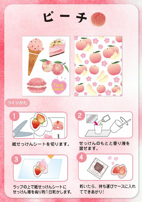 他の画像を見る 桃の香りの手作り紙せっけんが作れるキット クツワ フルーツかみせっけん ピーチ PT204D { 新入学文具 工作 図工 ホビー 自由研究 知育玩具 宿題 学習 課題 手作り 夏休み 紙石鹸 フルーツ }{ 文具 文房具 学用品 子供 キッズ 小学生 夏休み }400[23F16] メーカー希望小売価格 ¥ 715 のところ 当店特別価格 ¥ 537 税込 在庫切れ 再入荷お知らせ お気に入りに登録する