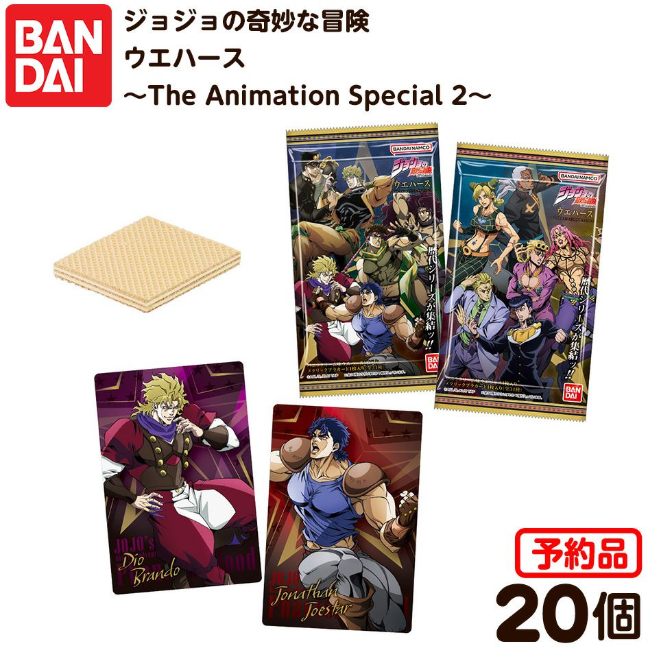 他の画像を見る 沖縄・離島発送不可予約品はその他の商品と一緒にご注文できません。新作食玩アイテムが続々登場☆ コレクション 大人買い まとめ買いに! 【予約品 2026年3月発売予定】 バンダイ ジョジョの奇妙な冒険 ウエハース ~The Animation Special 2~ 20個装入 Amazon Pay・代引・後払い決済不可 沖縄・離島発送不可{ 食玩 景品玩具 ジョジョ カード アニメ }{ おもちゃ 食玩 コレクション おかし }302[25K27][dmo] メーカー希望小売価格 ¥ 3,410 のところ 当店特別価格 ¥ 3,069 税込 販売開始前です。 販売期間 2026/02/28 0:00 〜 詳細を見る お気に入りに登録する