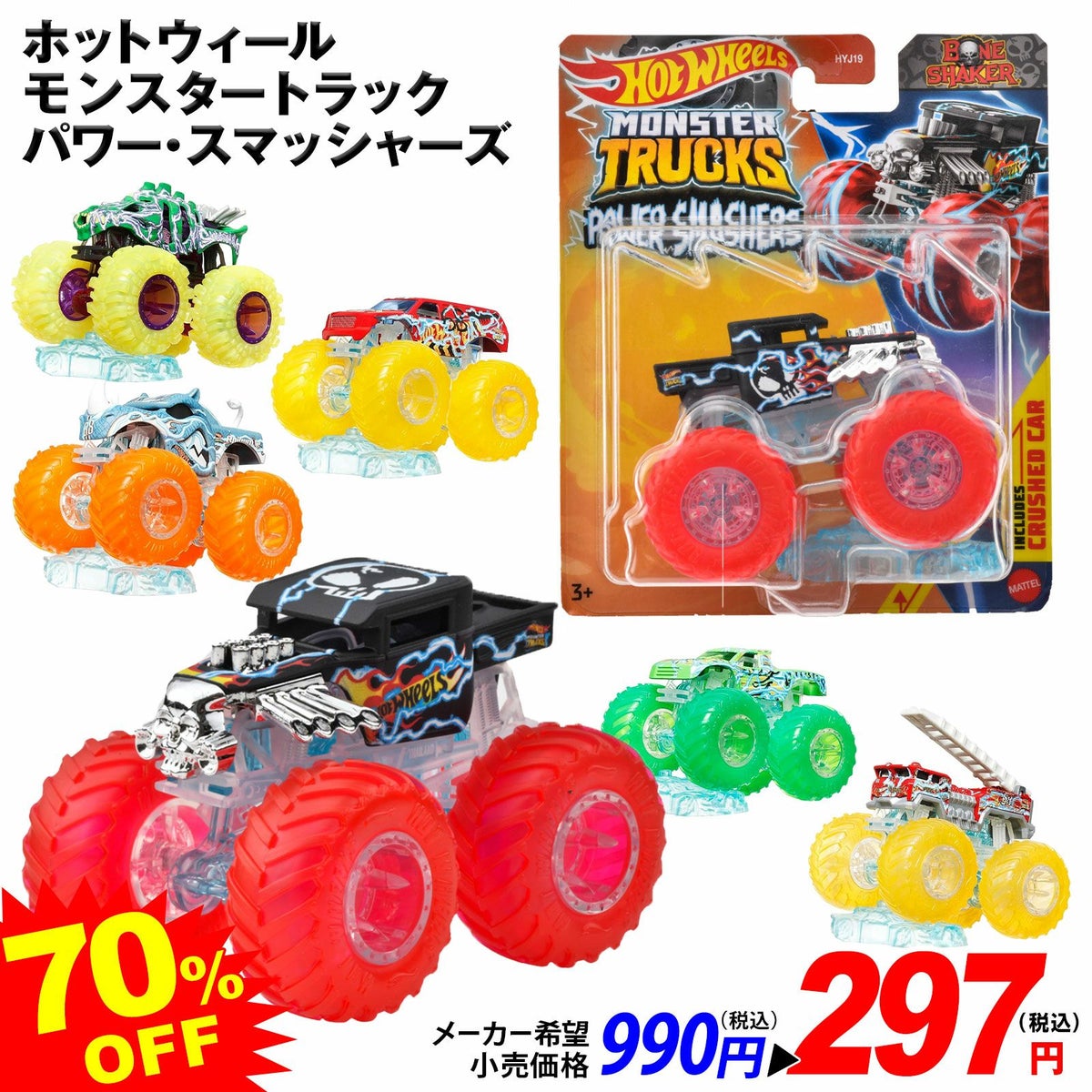 他の画像を見る 7割引!!大きなタイヤで迫力満点! ホットウィール モンスタートラック パワー・スマッシャーズ【柄指定不可】 { 特価玩具 車 車輪 モンスター トラック タイヤ }{ おもちゃ 玩具 オモチャ 特価 誕生日プレゼント ギフト 男の子 こども 子供 }[25J18]{即日出荷 配送区分D} メーカー希望小売価格 ¥ 990 のところ 当店特別価格 ¥ 297 税込 カートに入れる お気に入りに登録する
